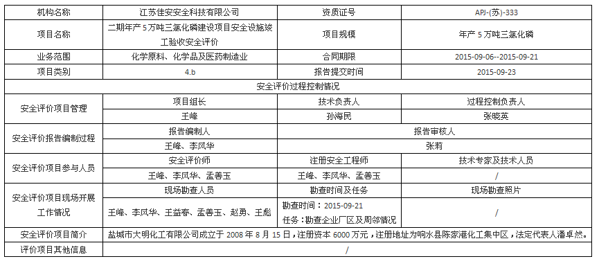 鹽城市大明化工有限公司 二期年產5萬噸三氯化磷建設項目安全設施竣工驗收安全評價