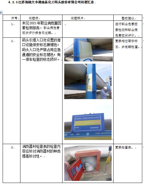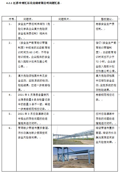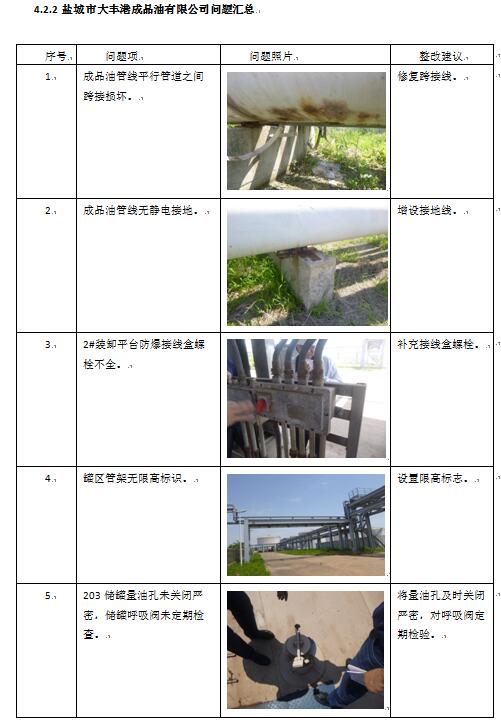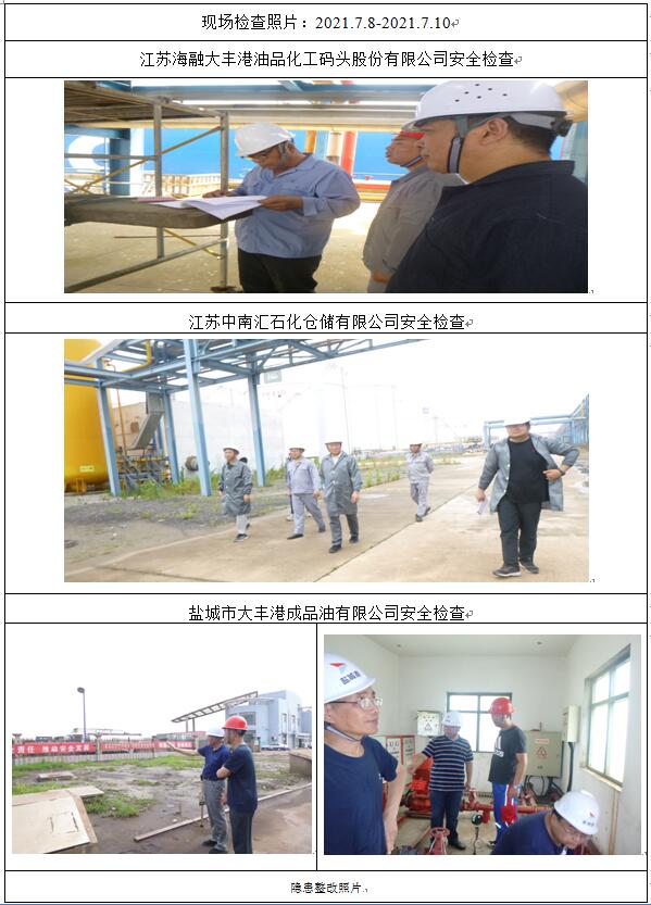 1 | 江蘇中南匯石化倉儲有限公司、江蘇海融大豐港油品化工碼頭股份有限公司、鹽城市大豐港成品油有限公司安全檢查報告 | 2021.7 | ||