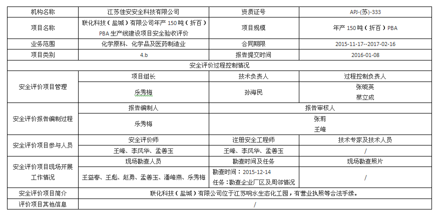 聯(lián)化科技(鹽城)有限公司 年產(chǎn)150噸(折百)PBA生產(chǎn)線建設(shè)項目安全驗收評價