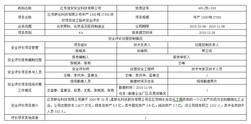 江蘇聯化科技有限公司 年產1300噸LT350技改項目竣工驗收安全評價