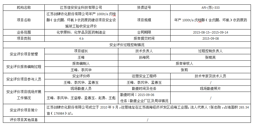 江蘇劍牌農化股份有限公司 年產1000t/a戊唑醇(含戊酮、環氧)農藥原藥建設項目安全設施竣工驗收安全評價
