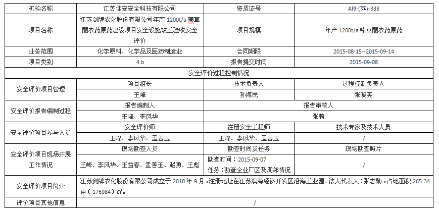 江蘇劍牌農(nóng)化股份有限公司 年產(chǎn)1200t/a嗪草酮農(nóng)藥原藥建設(shè)項目安全設(shè)施竣工驗收安全評價