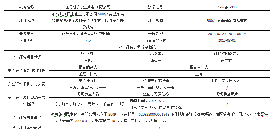 濱海納川民生化工有限公司 500t/a氨基葡萄糖鹽酸鹽建設項目安全設施竣工驗收安全評價報告