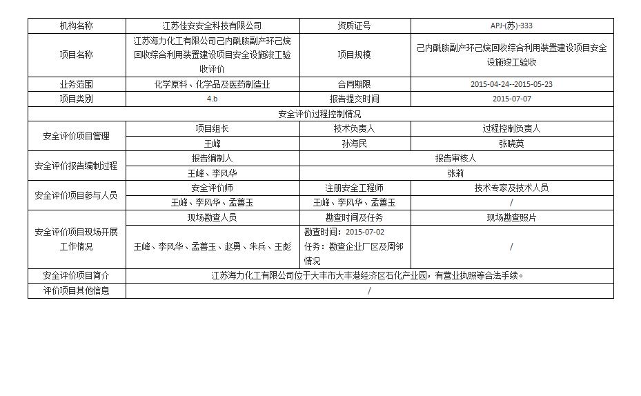 江蘇海力化工有限公司 己內酰胺副產環己烷回收綜合利用裝置建設項目安全設施竣工驗收評價