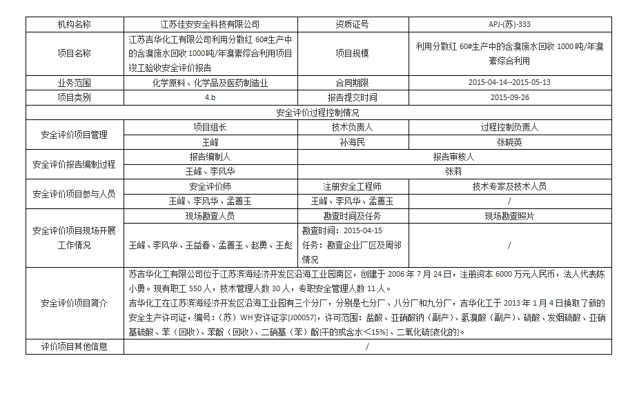 江蘇吉華化工有限公司 利用分散紅60#生產中的含溴廢水回收1000噸/年溴素綜合利用項目竣工驗收安全評價報告